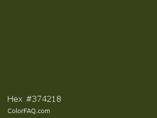 Hex #374218 Color is a very dark lime color and the nearest color is Thatch Green #403d19. Hex code #374218 and RGB value is rgb(55,66,24). In RGB color space, this color is composed of 22% red, 26% green, 9% blue, In CMYK color space, this color is composed of 17% cyan, 0% magenta, 64% yellow , 74% black , In HSL color space, this color has a hue angle of 76° , 47% saturation and 18% lightness.