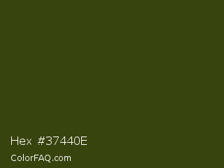 Hex #37440e Color is a very dark lime color and the nearest color is Clover #384910. Hex code #37440e and RGB value is rgb(55,68,14). In RGB color space, this color is composed of 22% red, 27% green, 5% blue, In CMYK color space, this color is composed of 19% cyan, 0% magenta, 79% yellow , 73% black , In HSL color space, this color has a hue angle of 74° , 66% saturation and 16% lightness.