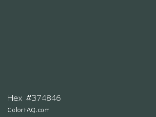 Hex #374846 Color is a dark cyan color and the nearest color is Cape Cod #3c4443. Hex code #374846 and RGB value is rgb(55,72,70). In RGB color space, this color is composed of 22% red, 28% green, 27% blue, In CMYK color space, this color is composed of 24% cyan, 0% magenta, 3% yellow , 72% black , In HSL color space, this color has a hue angle of 173° , 13% saturation and 25% lightness.