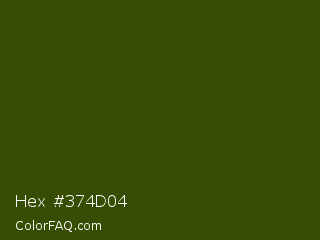 Hex #374d04 Color is a very dark lime color and the nearest color is Clover #384910. Hex code #374d04 and RGB value is rgb(55,77,4). In RGB color space, this color is composed of 22% red, 30% green, 2% blue, In CMYK color space, this color is composed of 29% cyan, 0% magenta, 95% yellow , 70% black , In HSL color space, this color has a hue angle of 78° , 90% saturation and 16% lightness.