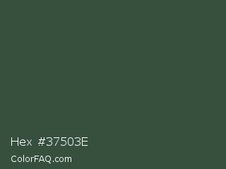 Hex #37503e Color is a dark green color and the nearest color is Lunar Green #3c493a. Hex code #37503e and RGB value is rgb(55,80,62). In RGB color space, this color is composed of 22% red, 31% green, 24% blue, In CMYK color space, this color is composed of 31% cyan, 0% magenta, 23% yellow , 69% black , In HSL color space, this color has a hue angle of 137° , 19% saturation and 26% lightness.