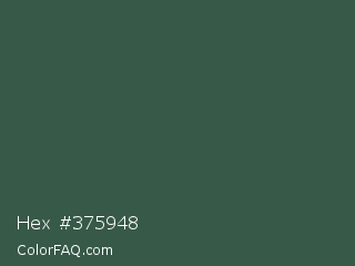 Hex #375948 Color is a dark green color and the nearest color is Stromboli #325d52. Hex code #375948 and RGB value is rgb(55,89,72). In RGB color space, this color is composed of 22% red, 35% green, 28% blue, In CMYK color space, this color is composed of 38% cyan, 0% magenta, 19% yellow , 65% black , In HSL color space, this color has a hue angle of 150° , 24% saturation and 28% lightness.