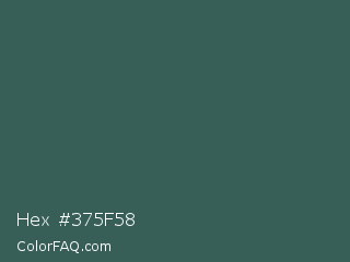 Hex #375f58 Color is a dark cyan color and the nearest color is Stromboli #325d52. Hex code #375f58 and RGB value is rgb(55,95,88). In RGB color space, this color is composed of 22% red, 37% green, 35% blue, In CMYK color space, this color is composed of 42% cyan, 0% magenta, 7% yellow , 63% black , In HSL color space, this color has a hue angle of 170° , 27% saturation and 29% lightness.