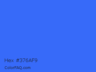 Hex #376af9 Color is a normal blue color and the nearest color is Ultramarine Blue #4166f5. Hex code #376af9 and RGB value is rgb(55,106,249). In RGB color space, this color is composed of 22% red, 42% green, 98% blue, In CMYK color space, this color is composed of 78% cyan, 57% magenta, 0% yellow , 2% black , In HSL color space, this color has a hue angle of 224° , 94% saturation and 60% lightness.