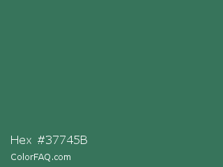 Hex #37745b Color is a normal green color and the nearest color is Amazon #3b7a57. Hex code #37745b and RGB value is rgb(55,116,91). In RGB color space, this color is composed of 22% red, 45% green, 36% blue, In CMYK color space, this color is composed of 53% cyan, 0% magenta, 22% yellow , 55% black , In HSL color space, this color has a hue angle of 155° , 36% saturation and 34% lightness.