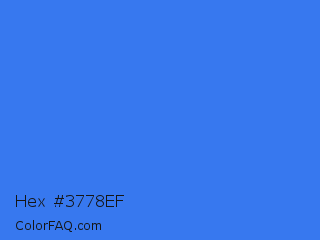Hex #3778ef Color is a normal blue color and the nearest color is Ultramarine Blue #4166f5. Hex code #3778ef and RGB value is rgb(55,120,239). In RGB color space, this color is composed of 22% red, 47% green, 94% blue, In CMYK color space, this color is composed of 77% cyan, 50% magenta, 0% yellow , 6% black , In HSL color space, this color has a hue angle of 219° , 85% saturation and 58% lightness.