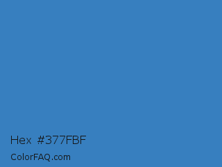 Hex #377fbf Color is a normal blue color and the nearest color is Cyan Blue Azure #4682bf. Hex code #377fbf and RGB value is rgb(55,127,191). In RGB color space, this color is composed of 22% red, 50% green, 75% blue, In CMYK color space, this color is composed of 71% cyan, 34% magenta, 0% yellow , 25% black , In HSL color space, this color has a hue angle of 208° , 55% saturation and 48% lightness.