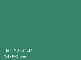 Hex #37846d Color is a normal green color and the nearest color is Viridian #40826d. Hex code #37846d and RGB value is rgb(55,132,109). In RGB color space, this color is composed of 22% red, 52% green, 43% blue, In CMYK color space, this color is composed of 58% cyan, 0% magenta, 17% yellow , 48% black , In HSL color space, this color has a hue angle of 162° , 41% saturation and 37% lightness.
