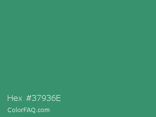 Hex #37936e Color is a normal green color and the nearest color is Illuminating Emerald #319177. Hex code #37936e and RGB value is rgb(55,147,110). In RGB color space, this color is composed of 22% red, 58% green, 43% blue, In CMYK color space, this color is composed of 63% cyan, 0% magenta, 25% yellow , 42% black , In HSL color space, this color has a hue angle of 156° , 46% saturation and 40% lightness.