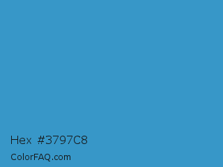 Hex #3797c8 Color is a normal blue color and the nearest color is Celestial Blue #4997d0. Hex code #3797c8 and RGB value is rgb(55,151,200). In RGB color space, this color is composed of 22% red, 59% green, 78% blue, In CMYK color space, this color is composed of 73% cyan, 25% magenta, 0% yellow , 22% black , In HSL color space, this color has a hue angle of 200° , 57% saturation and 50% lightness.