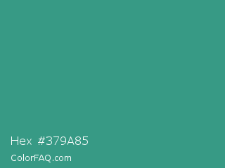 Hex #379a85 Color is a normal cyan color and the nearest color is Zomp #39a78e. Hex code #379a85 and RGB value is rgb(55,154,133). In RGB color space, this color is composed of 22% red, 60% green, 52% blue, In CMYK color space, this color is composed of 64% cyan, 0% magenta, 14% yellow , 40% black , In HSL color space, this color has a hue angle of 167° , 47% saturation and 41% lightness.