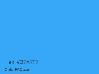 Hex #37a7f7 Color is a normal blue color and the nearest color is Brilliant Azure #3399ff. Hex code #37a7f7 and RGB value is rgb(55,167,247). In RGB color space, this color is composed of 22% red, 65% green, 97% blue, In CMYK color space, this color is composed of 78% cyan, 32% magenta, 0% yellow , 3% black , In HSL color space, this color has a hue angle of 205° , 92% saturation and 59% lightness.