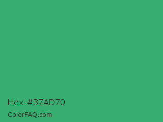 Hex #37ad70 Color is a normal green color and the nearest color is Medium Sea Green #3cb371. Hex code #37ad70 and RGB value is rgb(55,173,112). In RGB color space, this color is composed of 22% red, 68% green, 44% blue, In CMYK color space, this color is composed of 68% cyan, 0% magenta, 35% yellow , 32% black , In HSL color space, this color has a hue angle of 149° , 52% saturation and 45% lightness.