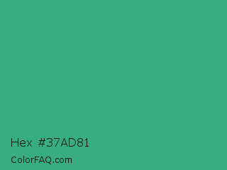 Hex #37ad81 Color is a normal green color and the nearest color is Mint #3eb489. Hex code #37ad81 and RGB value is rgb(55,173,129). In RGB color space, this color is composed of 22% red, 68% green, 51% blue, In CMYK color space, this color is composed of 68% cyan, 0% magenta, 25% yellow , 32% black , In HSL color space, this color has a hue angle of 158° , 52% saturation and 45% lightness.