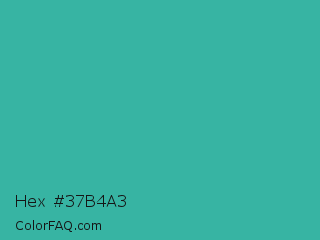Hex #37b4a3 Color is a normal cyan color and the nearest color is Keppel #3ab09e. Hex code #37b4a3 and RGB value is rgb(55,180,163). In RGB color space, this color is composed of 22% red, 71% green, 64% blue, In CMYK color space, this color is composed of 69% cyan, 0% magenta, 9% yellow , 29% black , In HSL color space, this color has a hue angle of 172° , 53% saturation and 46% lightness.