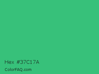 Hex #37c17a Color is a normal green color and the nearest color is Medium Sea Green #3cb371. Hex code #37c17a and RGB value is rgb(55,193,122). In RGB color space, this color is composed of 22% red, 76% green, 48% blue, In CMYK color space, this color is composed of 72% cyan, 0% magenta, 37% yellow , 24% black , In HSL color space, this color has a hue angle of 149° , 56% saturation and 49% lightness.