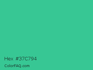 Hex #37c794 Color is a normal green color and the nearest color is Shamrock #33cc99. Hex code #37c794 and RGB value is rgb(55,199,148). In RGB color space, this color is composed of 22% red, 78% green, 58% blue, In CMYK color space, this color is composed of 72% cyan, 0% magenta, 26% yellow , 22% black , In HSL color space, this color has a hue angle of 159° , 57% saturation and 50% lightness.