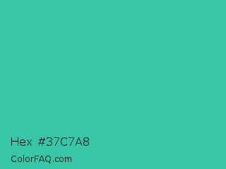 Hex #37c7a8 Color is a normal cyan color and the nearest color is Puerto Rico #3fc1aa. Hex code #37c7a8 and RGB value is rgb(55,199,168). In RGB color space, this color is composed of 22% red, 78% green, 66% blue, In CMYK color space, this color is composed of 72% cyan, 0% magenta, 16% yellow , 22% black , In HSL color space, this color has a hue angle of 167° , 57% saturation and 50% lightness.