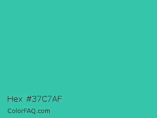 Hex #37c7af Color is a normal cyan color and the nearest color is Puerto Rico #3fc1aa. Hex code #37c7af and RGB value is rgb(55,199,175). In RGB color space, this color is composed of 22% red, 78% green, 69% blue, In CMYK color space, this color is composed of 72% cyan, 0% magenta, 12% yellow , 22% black , In HSL color space, this color has a hue angle of 170° , 57% saturation and 50% lightness.