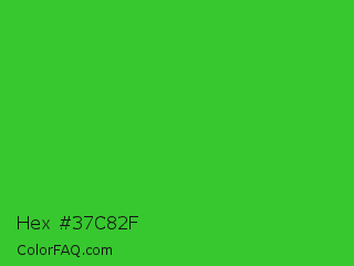 Hex #37c82f Color is a normal green color and the nearest color is Lime Green #32cd32. Hex code #37c82f and RGB value is rgb(55,200,47). In RGB color space, this color is composed of 22% red, 78% green, 18% blue, In CMYK color space, this color is composed of 73% cyan, 0% magenta, 77% yellow , 22% black , In HSL color space, this color has a hue angle of 117° , 62% saturation and 48% lightness.