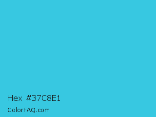 Hex #37c8e1 Color is a normal cyan color and the nearest color is Scooter #2ebfd4. Hex code #37c8e1 and RGB value is rgb(55,200,225). In RGB color space, this color is composed of 22% red, 78% green, 88% blue, In CMYK color space, this color is composed of 76% cyan, 11% magenta, 0% yellow , 12% black , In HSL color space, this color has a hue angle of 189° , 74% saturation and 55% lightness.