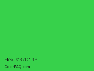 Hex #37d14b Color is a normal green color and the nearest color is Lime Green #32cd32. Hex code #37d14b and RGB value is rgb(55,209,75). In RGB color space, this color is composed of 22% red, 82% green, 29% blue, In CMYK color space, this color is composed of 74% cyan, 0% magenta, 64% yellow , 18% black , In HSL color space, this color has a hue angle of 128° , 63% saturation and 52% lightness.