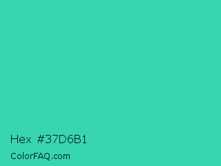 Hex #37d6b1 Color is a normal cyan color and the nearest color is Eucalyptus #44d7a8. Hex code #37d6b1 and RGB value is rgb(55,214,177). In RGB color space, this color is composed of 22% red, 84% green, 69% blue, In CMYK color space, this color is composed of 74% cyan, 0% magenta, 17% yellow , 16% black , In HSL color space, this color has a hue angle of 166° , 66% saturation and 53% lightness.