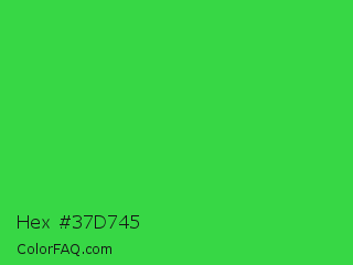 Hex #37d745 Color is a normal green color and the nearest color is Lime Green #32cd32. Hex code #37d745 and RGB value is rgb(55,215,69). In RGB color space, this color is composed of 22% red, 84% green, 27% blue, In CMYK color space, this color is composed of 74% cyan, 0% magenta, 68% yellow , 16% black , In HSL color space, this color has a hue angle of 125° , 67% saturation and 53% lightness.