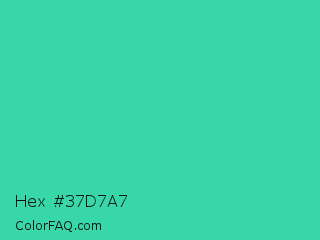 Hex #37d7a7 Color is a normal green color and the nearest color is Eucalyptus #44d7a8. Hex code #37d7a7 and RGB value is rgb(55,215,167). In RGB color space, this color is composed of 22% red, 84% green, 65% blue, In CMYK color space, this color is composed of 74% cyan, 0% magenta, 22% yellow , 16% black , In HSL color space, this color has a hue angle of 162° , 67% saturation and 53% lightness.