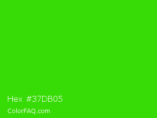 Hex #37db05 Color is a normal green color and the nearest color is Harlequin Green #46cb18. Hex code #37db05 and RGB value is rgb(55,219,5). In RGB color space, this color is composed of 22% red, 86% green, 2% blue, In CMYK color space, this color is composed of 75% cyan, 0% magenta, 98% yellow , 14% black , In HSL color space, this color has a hue angle of 106° , 96% saturation and 44% lightness.