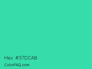 Hex #37dcab Color is a normal green color and the nearest color is Eucalyptus #44d7a8. Hex code #37dcab and RGB value is rgb(55,220,171). In RGB color space, this color is composed of 22% red, 86% green, 67% blue, In CMYK color space, this color is composed of 75% cyan, 0% magenta, 22% yellow , 14% black , In HSL color space, this color has a hue angle of 162° , 70% saturation and 54% lightness.