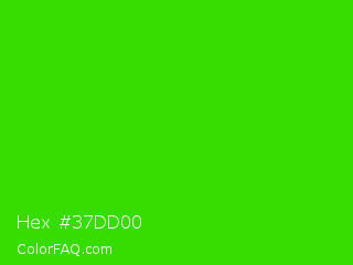 Hex #37dd00 Color is a normal green color and the nearest color is Harlequin Green #46cb18. Hex code #37dd00 and RGB value is rgb(55,221,0). In RGB color space, this color is composed of 22% red, 87% green, 0% blue, In CMYK color space, this color is composed of 75% cyan, 0% magenta, 100% yellow , 13% black , In HSL color space, this color has a hue angle of 105° , 100% saturation and 43% lightness.