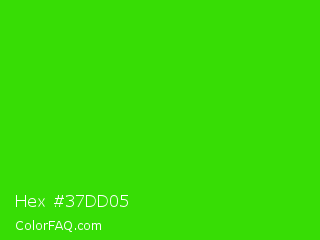 Hex #37dd05 Color is a normal green color and the nearest color is Harlequin Green #46cb18. Hex code #37dd05 and RGB value is rgb(55,221,5). In RGB color space, this color is composed of 22% red, 87% green, 2% blue, In CMYK color space, this color is composed of 75% cyan, 0% magenta, 98% yellow , 13% black , In HSL color space, this color has a hue angle of 106° , 96% saturation and 44% lightness.