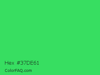 Hex #37de61 Color is a normal green color and the nearest color is UFO Green #3cd070. Hex code #37de61 and RGB value is rgb(55,222,97). In RGB color space, this color is composed of 22% red, 87% green, 38% blue, In CMYK color space, this color is composed of 75% cyan, 0% magenta, 56% yellow , 13% black , In HSL color space, this color has a hue angle of 135° , 72% saturation and 54% lightness.