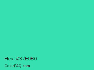 Hex #37e0b0 Color is a normal green color and the nearest color is Eucalyptus #44d7a8. Hex code #37e0b0 and RGB value is rgb(55,224,176). In RGB color space, this color is composed of 22% red, 88% green, 69% blue, In CMYK color space, this color is composed of 75% cyan, 0% magenta, 21% yellow , 12% black , In HSL color space, this color has a hue angle of 163° , 73% saturation and 55% lightness.
