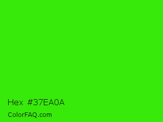 Hex #37ea0a Color is a normal green color and the nearest color is Neon Green #39ff14. Hex code #37ea0a and RGB value is rgb(55,234,10). In RGB color space, this color is composed of 22% red, 92% green, 4% blue, In CMYK color space, this color is composed of 76% cyan, 0% magenta, 96% yellow , 8% black , In HSL color space, this color has a hue angle of 108° , 92% saturation and 48% lightness.