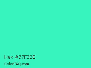 Hex #37f3be Color is a normal green color and the nearest color is Turquoise #40e0d0. Hex code #37f3be and RGB value is rgb(55,243,190). In RGB color space, this color is composed of 22% red, 95% green, 75% blue, In CMYK color space, this color is composed of 77% cyan, 0% magenta, 22% yellow , 5% black , In HSL color space, this color has a hue angle of 163° , 89% saturation and 58% lightness.