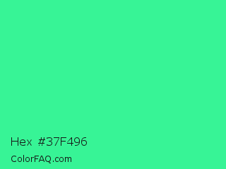 Hex #37f496 Color is a normal green color and the nearest color is Eucalyptus #44d7a8. Hex code #37f496 and RGB value is rgb(55,244,150). In RGB color space, this color is composed of 22% red, 96% green, 59% blue, In CMYK color space, this color is composed of 77% cyan, 0% magenta, 39% yellow , 4% black , In HSL color space, this color has a hue angle of 150° , 90% saturation and 59% lightness.
