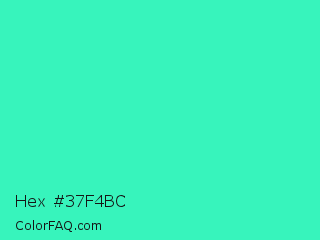 Hex #37f4bc Color is a normal green color and the nearest color is Turquoise #40e0d0. Hex code #37f4bc and RGB value is rgb(55,244,188). In RGB color space, this color is composed of 22% red, 96% green, 74% blue, In CMYK color space, this color is composed of 77% cyan, 0% magenta, 23% yellow , 4% black , In HSL color space, this color has a hue angle of 162° , 90% saturation and 59% lightness.