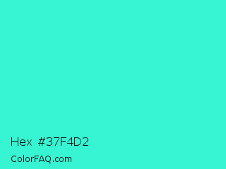Hex #37f4d2 Color is a normal cyan color and the nearest color is Turquoise #40e0d0. Hex code #37f4d2 and RGB value is rgb(55,244,210). In RGB color space, this color is composed of 22% red, 96% green, 82% blue, In CMYK color space, this color is composed of 77% cyan, 0% magenta, 14% yellow , 4% black , In HSL color space, this color has a hue angle of 169° , 90% saturation and 59% lightness.