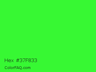 Hex #37f833 Color is a normal green color and the nearest color is Neon Green #39ff14. Hex code #37f833 and RGB value is rgb(55,248,51). In RGB color space, this color is composed of 22% red, 97% green, 20% blue, In CMYK color space, this color is composed of 78% cyan, 0% magenta, 79% yellow , 3% black , In HSL color space, this color has a hue angle of 119° , 93% saturation and 59% lightness.
