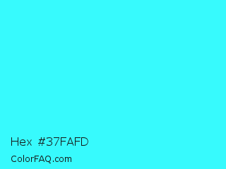 Hex #37fafd Color is a normal cyan color and the nearest color is Loeen #15f2fd. Hex code #37fafd and RGB value is rgb(55,250,253). In RGB color space, this color is composed of 22% red, 98% green, 99% blue, In CMYK color space, this color is composed of 78% cyan, 1% magenta, 0% yellow , 1% black , In HSL color space, this color has a hue angle of 181° , 98% saturation and 60% lightness.