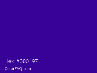 Hex #380197 Color is a dark violet color and the nearest color is Blue Gem #2c0e8c. Hex code #380197 and RGB value is rgb(56,1,151). In RGB color space, this color is composed of 22% red, 0% green, 59% blue, In CMYK color space, this color is composed of 63% cyan, 99% magenta, 0% yellow , 41% black , In HSL color space, this color has a hue angle of 262° , 99% saturation and 30% lightness.