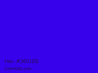 Hex #3801eb Color is a normal indigo color and the nearest color is Electric Ultramarine #3f00ff. Hex code #3801eb and RGB value is rgb(56,1,235). In RGB color space, this color is composed of 22% red, 0% green, 92% blue, In CMYK color space, this color is composed of 76% cyan, 100% magenta, 0% yellow , 8% black , In HSL color space, this color has a hue angle of 254° , 99% saturation and 46% lightness.