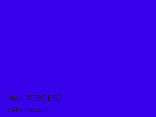 Hex #3801ec Color is a normal indigo color and the nearest color is Electric Ultramarine #3f00ff. Hex code #3801ec and RGB value is rgb(56,1,236). In RGB color space, this color is composed of 22% red, 0% green, 93% blue, In CMYK color space, this color is composed of 76% cyan, 100% magenta, 0% yellow , 7% black , In HSL color space, this color has a hue angle of 254° , 99% saturation and 46% lightness.
