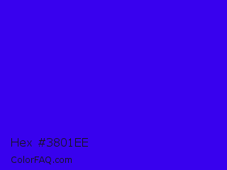 Hex #3801ee Color is a normal indigo color and the nearest color is Electric Ultramarine #3f00ff. Hex code #3801ee and RGB value is rgb(56,1,238). In RGB color space, this color is composed of 22% red, 0% green, 93% blue, In CMYK color space, this color is composed of 76% cyan, 100% magenta, 0% yellow , 7% black , In HSL color space, this color has a hue angle of 254° , 99% saturation and 47% lightness.