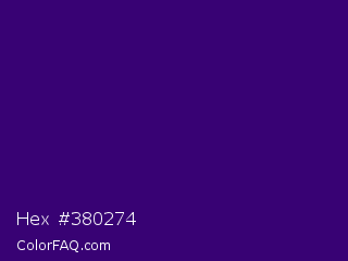 Hex #380274 Color is a dark violet color and the nearest color is Blue Diamond #380474. Hex code #380274 and RGB value is rgb(56,2,116). In RGB color space, this color is composed of 22% red, 1% green, 45% blue, In CMYK color space, this color is composed of 52% cyan, 98% magenta, 0% yellow , 55% black , In HSL color space, this color has a hue angle of 268° , 97% saturation and 23% lightness.