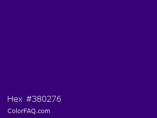 Hex #380276 Color is a dark violet color and the nearest color is Blue Diamond #380474. Hex code #380276 and RGB value is rgb(56,2,118). In RGB color space, this color is composed of 22% red, 1% green, 46% blue, In CMYK color space, this color is composed of 53% cyan, 98% magenta, 0% yellow , 54% black , In HSL color space, this color has a hue angle of 268° , 97% saturation and 24% lightness.