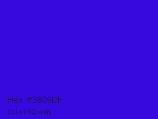 Hex #3809df Color is a normal indigo color and the nearest color is Interdimensional Blue #360ccc. Hex code #3809df and RGB value is rgb(56,9,223). In RGB color space, this color is composed of 22% red, 4% green, 87% blue, In CMYK color space, this color is composed of 75% cyan, 96% magenta, 0% yellow , 13% black , In HSL color space, this color has a hue angle of 253° , 92% saturation and 45% lightness.