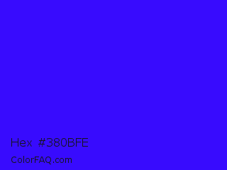 Hex #380bfe Color is a normal indigo color and the nearest color is Electric Ultramarine #3f00ff. Hex code #380bfe and RGB value is rgb(56,11,254). In RGB color space, this color is composed of 22% red, 4% green, 100% blue, In CMYK color space, this color is composed of 78% cyan, 96% magenta, 0% yellow , 0% black , In HSL color space, this color has a hue angle of 251° , 99% saturation and 52% lightness.